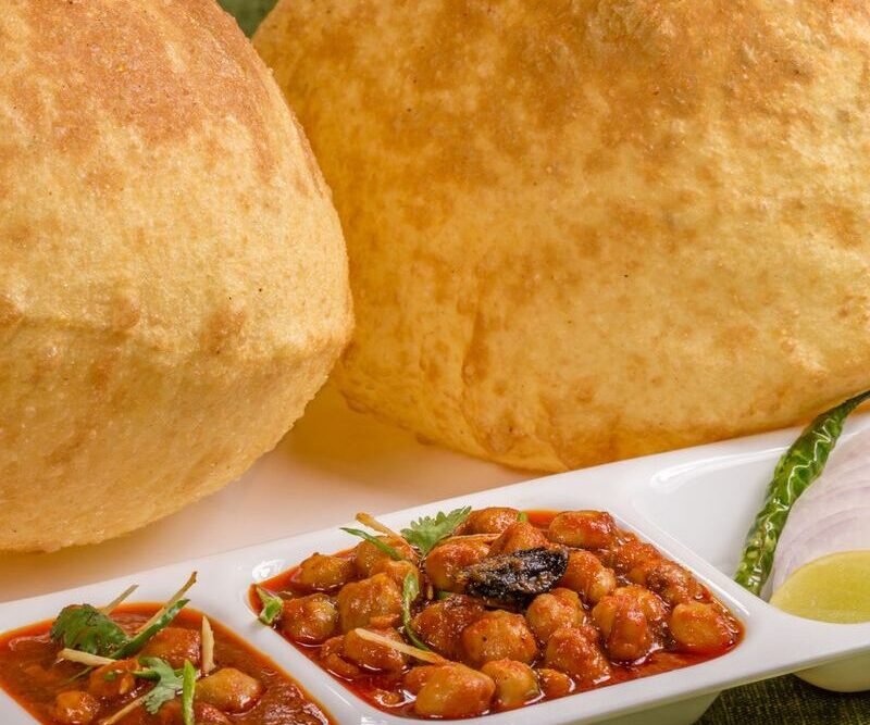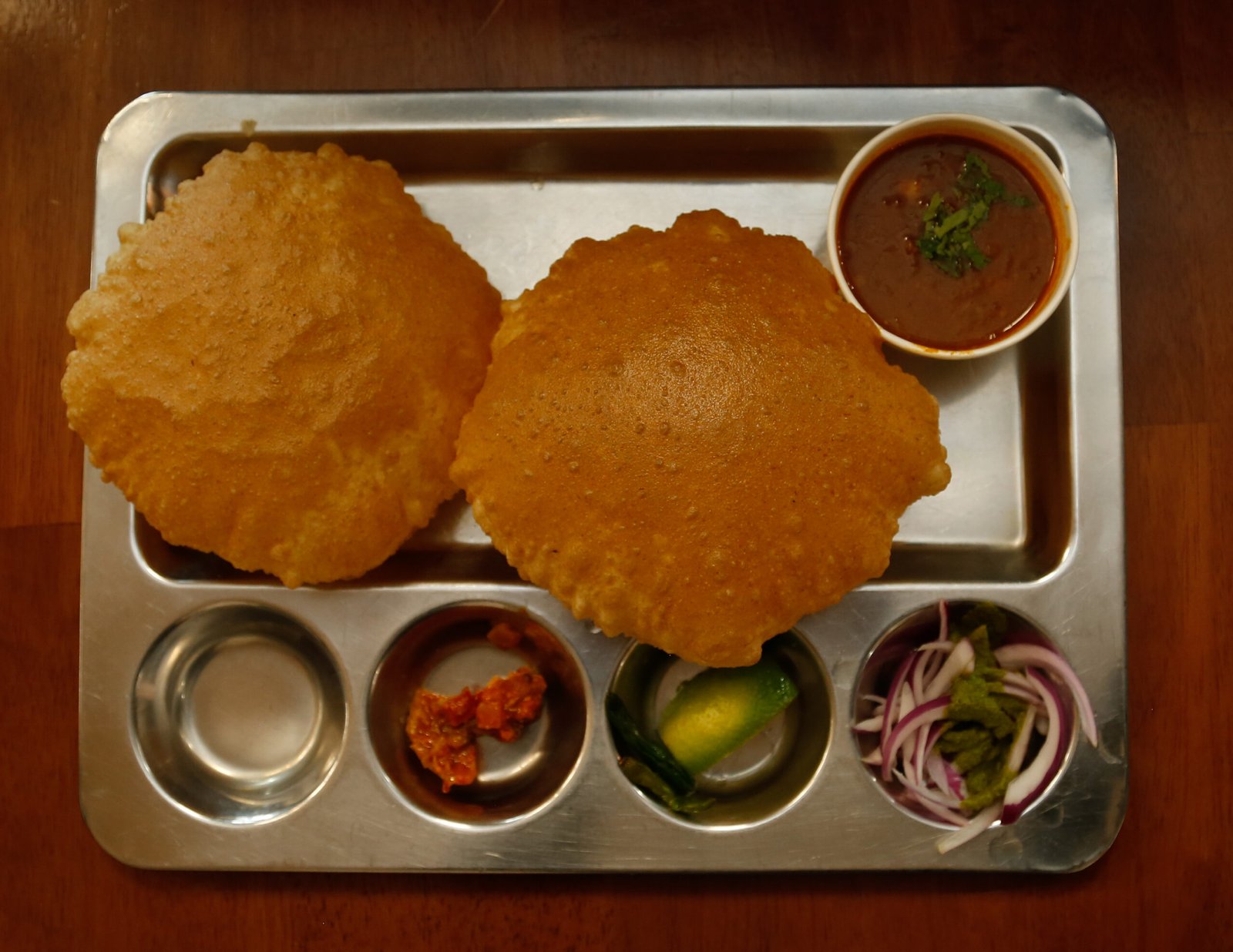 2 pieces of fried flatbread with spiced and curried chickpeas